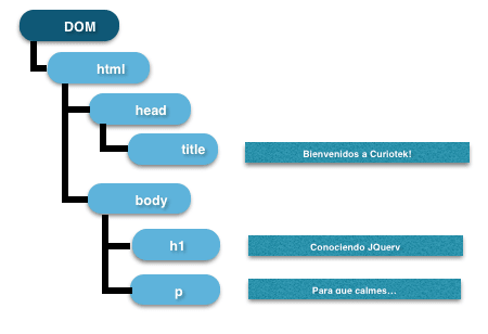 Nuestro explorador (ya sea Chrome, Firefox, Safari e incluso el patito feo Internet Explorer) organiza el HTML que recibe del servidor web a través de algo llamado Document Object Model o DOM, que viene siendo una estructura organizada cómo la siguiente: