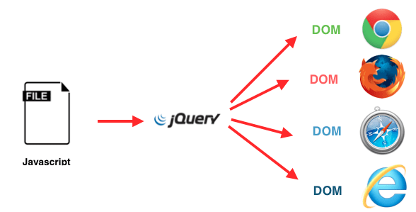 Como se mencionó antes Javascript es un lenguaje que nos permite interactuar con elementos del DOM, pero entonces, ¿para qué necesitamos a jQuery? Bueno la cosa no es tan sencilla, pues cada explorador web tiene una interfaz DOM ligeramente diferente, entonces usando únicamente Javascript sería necesario escribir un código diferente para cada explorador. Afortunadamente es aquí donde jQuery entra al rescate, pues si Javascript usa jQuery para interactuar con el DOM entonces el código funcionará para la mayoría de los exploradores. Así jQuery se convierte en uno de los frameworks de Javascript más importantes.