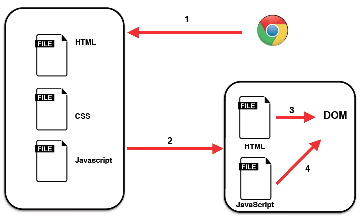 Cuando escribes una dirección URL desde tu explorador (1), en realidad estás haciendo una petición a un _servidor(http://es.wikipedia.org/wiki/Servidor_web “Servidor web”), este servidor te responde enviándote varios archivos entre los cuales se encuentran archivos HTML, Javascript y CSS (2). El explorador va a cargar el HTML dentro del DOM (3) y una vez cargado, Javascript puede interactuar con elementos de la web. Pero un momento, ¿qué es el DOM?