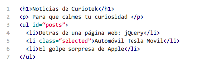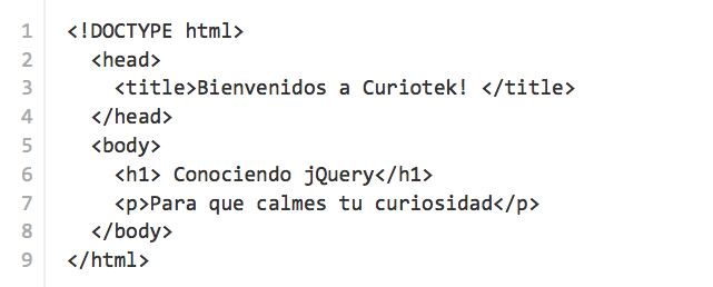 jQuery(“h1”); jQuery(“p”); O lo que es igual: $(“h1”); $(“p”); Utilizando la función text(), que es una función proporcionada por jQuery, podemos obtener y cambiar el contenido de un elemento. De tal forma que $(“h1”).text(); Regresa el contenido del elemento h1: Conociendo jQuery, y $(“h1”).text(“Un título diferente”) Cambiaría el contenido del elemento. El código completo quedaría de la siguiente manera $(document).ready(function(){ $(“h1”).text(“Un título diferente”); $(“p”).text(“Todo un curioso”); }); ¿Qué pasa si tenemos múltiples elementos h1? ¿Cómo le indicamos a jQuery que queremos seleccionar uno en particular? Hay múltiples soluciones para esta problemática, observa el siguiente ejemplo: