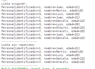 personas.add(new Persona(1, “Juan”, 21)); personas.add(new Persona(2, “Martin”, 18)); personas.add(new Persona(3, “Luis”, 26)); personas.add(new Persona(1, “Juan”, 21)); personas.add(new Persona(6, “Daniela”, 22)); personas.add(new Persona(3, “Luis”, 26)); personas.add(new Persona(6, “Alberto”, 20)); personas.add(new Persona(7, “Araceli”, 29)); personas.add(new Persona(1, “Juan”, 21)); personas.add(new Persona(6, “Daniela”, 22));