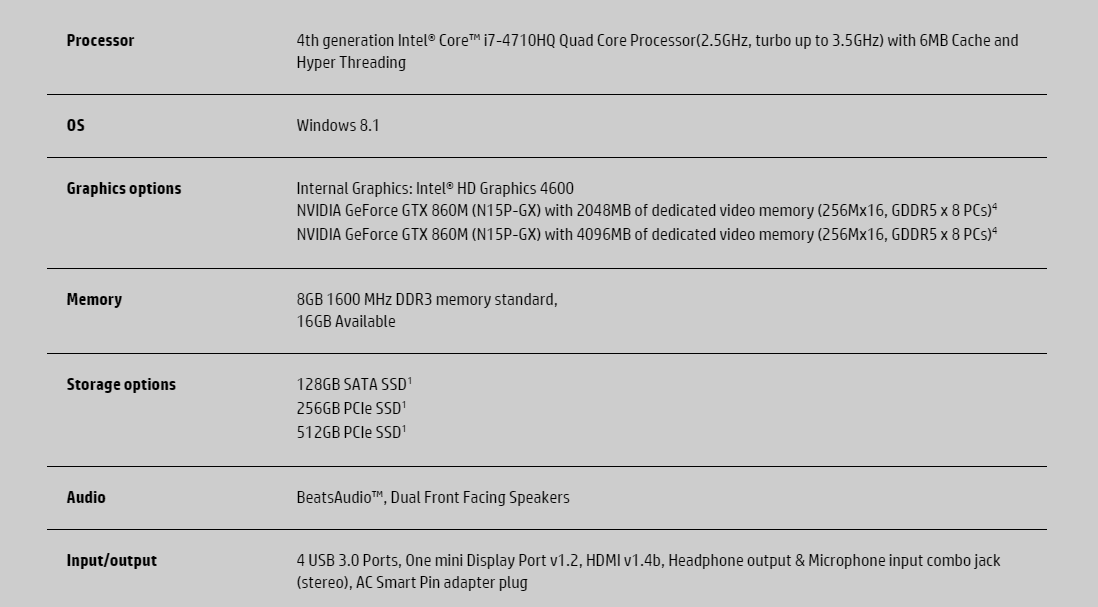 Hablando de la máquina propiamente, la parte física, tiene un grosor aproximado de 19 milímetros y no pesa más de 3kg, gráficos NVidia GTX 860M, hay máquinas más potente que eso, pero justamente HP salió a la defensa diciendo que tanto el sistema de refrigeración como la resolución permitirían a esos 860M trabajar óptimamente. Ver para creer. Procesador Intel Core i7-4710HQ, 8GB 1600 MHz DDR3 y SSD de 128 GB – 256 GB ó 512 GB - Funciona con Windows 8. ¿Podemos decir que un equipo de gama alta?, si uno tiene los conocimientos o un buen amigo que sabe de computadoras, y tiene la buena fe de armarnos una PC Gamer creo que hay otros componentes que son mejores y bueno, sí caros, pero imaginemos que tenemos mucho dinero y que podemos hacerlo, es una alternativa, comprar por partes y armarla, o bien comprar lo que hay en el mercado que tampoco es malo. En mi caso tengo amigos que me podrían armar una pero siempre recuerdo que soy pobre y me conformo con mi PlayStation 2.